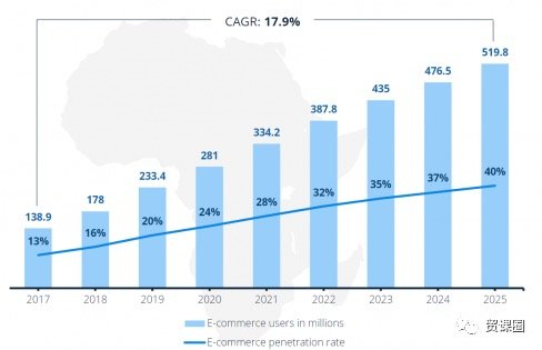 Africa has the youngest population structure in the world, with young people accounting for 70%. Therefore, its huge demographic dividend has also become an important reserve force for the short-term take-off of the e-commerce market in the region. The African E-Commerce White Paper jointly released by African technology companies TechCabal and Klasha shows that in 2022, there will be about 387 million e-commerce users in Africa, and the e-commerce penetration rate is 32%. It is estimated that by 2025, e-commerce users will exceed 500 million, and the penetration rate will The compound annual growth rate of e-commerce users is 17.9%. The market size of e-commerce in Africa was US$16 billion in 2017, and this figure will reach US$75 billion by 2025.